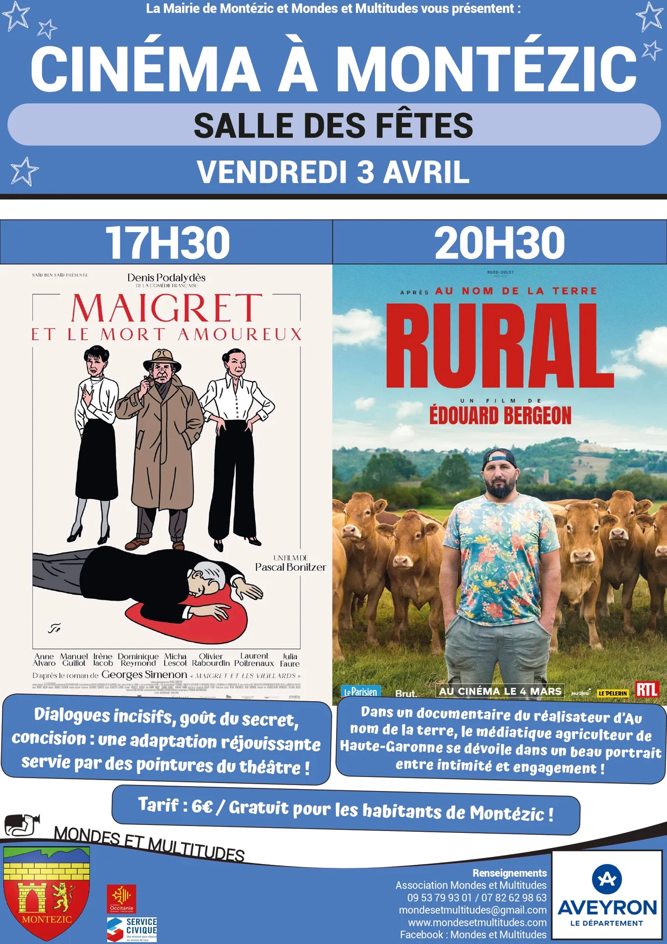 17h30 : « Maigret et le mort amoureux » et à 20h30 : « Rural » à la salle des fêtes de Montézic.